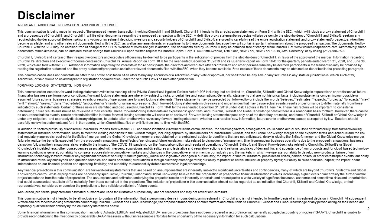 2 Disclaimer IMPORTANT ADDITIONAL INFORMATION AND WHERE TO FIND IT This communication is being made in respect of the proposed merger transaction involving Churchill II and Skillsoft. Churchil l I I intends to file a registration statement on Form S - 4 with the SEC, which will include a proxy statement of Churchill II and a prospectus of Churchill II, and Churchill II will file other documents regarding the proposed transaction with the SEC. A definitive proxy statement/prospectus will also be sent to the stockholders of Churchill II and Skillsoft, seeking any required stockholder approval. Before making any voting or investment decision, investors and security holders of Churchill I I a nd Skillsoft are urged to carefully read the entire registration statement and proxy statement/prospectus, when they become available, and any other relevant documents filed with the SEC, as well as any amendments or supplements to these docu men ts, because they will contain important information about the proposed transaction. The documents filed by Churchill II with the SEC may be obtained free of charge at the SEC’s website at www.sec.gov. In addition, the documents file d b y Churchill II may be obtained free of charge from Churchill II at www.churchillcapitalcorp.com. Alternatively, these documents, when available, can be obtained free of charge from Churchill II upon written request to Churchill Capital Corp II , 6 40 Fifth Avenue, 12th Floor, New York, New York 10019, Attn: Secretary, or by calling (212) 380 - 7500. Churchill II, Skillsoft and certain of their respective directors and executive officers may be deemed to be participants in the solicitation of proxies from the stockholders of Churchill II, in favor of the approval of the merger. Information regarding Churchill II’s directors and executive officers is contained in Churchill II’s Annual Report on Form 10 K for the year ended Dec ember 31, 2019 and its Quarterly Report on Form 10 - Q for the quarterly periods ended March 31, 2020, and June 30, 2020, which are filed with the SEC. Additional information regarding the interests of those participants, the directors and e xec utive officers of Skillsoft and other persons who may be deemed participants in the transaction may be obtained by reading the registration statement and the proxy statement/prospectus and other relevant documents filed with the SEC when th ey become available. Free copies of these documents may be obtained as described in the preceding paragraph. This communication does not constitute an offer to sell or the solicitation of an offer to buy any securities or a solicitati on of any vote or approval, nor shall there be any sale of any securities in any state or jurisdiction in which such offer, solicitation, or sale would be unlawful prior to registration or qualification under the securities laws of such other jurisd ict ion. FORWARD - LOOKING STATEMENTS This communication contains forward - looking statements within the meaning of the Private Securities Litigation Reform Act of 199 5 including, but not limited to, Churchill’s, Skillsoft’s and Global Knowledge’s expectations or predictions of future financial or business performance or conditions. Forward - looking statements are inherently subject to risks, uncertainties and a ssumptions. Generally, statements that are not historical facts, including statements concerning our possible or assumed future actions, business strategies, events or results of operations, are forward - looking statements. These statements m ay be preceded by, followed by or include the words “believes,” “estimates,” “expects,” “projects,” “forecasts,” “may,” “will,” “should,” “seeks,” “plans,” “scheduled,” “anticipates” or “intends” or similar expressions. Such forward - looking stateme nts involve risks and uncertainties that may cause actual events, results or performance to differ materially from those indicated by such statements. Certain of these risks are identified and discussed in Churchill’s Form 10 - K for the year ended De cember 31, 2019 under Risk Factors in Part I, Item 1A. These risk factors will be important to consider in determining future results and should be reviewed in their entirety. These forward - looking statements are expressed in good faith, and Churc hill, Skillsoft and Global Knowledge believe there is a reasonable basis for them. However, there can be no assurance that the events, results or trends identified in these forward - looking statements will occur or be achieved. Forward - l ooking statements speak only as of the date they are made, and none of Churchill, Skillsoft or Global Knowledge is under any obligation, and expressly disclaim any obligation, to update, alter or otherwise revise any forward - looking statement, whether as a result of new information, future events or otherwise, except as required by law. Readers should carefully review the statements set forth in the reports, which Churchill has filed or will file from time to time with the S EC. In addition to factors previously disclosed in Churchill’s reports filed with the SEC and those identified elsewhere in this com munication, the following factors, among others, could cause actual results to differ materially from forward - looking statements or historical performance: ability to meet the closing conditions to the Skillsoft merger, including approval by s toc kholders of Churchill and Skillsoft, and the Global Knowledge merger on the expected terms and schedule and the risk that regulatory approvals required for the Skillsoft merger and the Global Knowledge merger are not obtained or are obtained sub ject to conditions that are not anticipated; delay in closing the Skillsoft merger and the Global Knowledge merger; failure to realize the benefits expected from the proposed transactions; the effects of pending and future legislation; risks re lated to disruption of managem