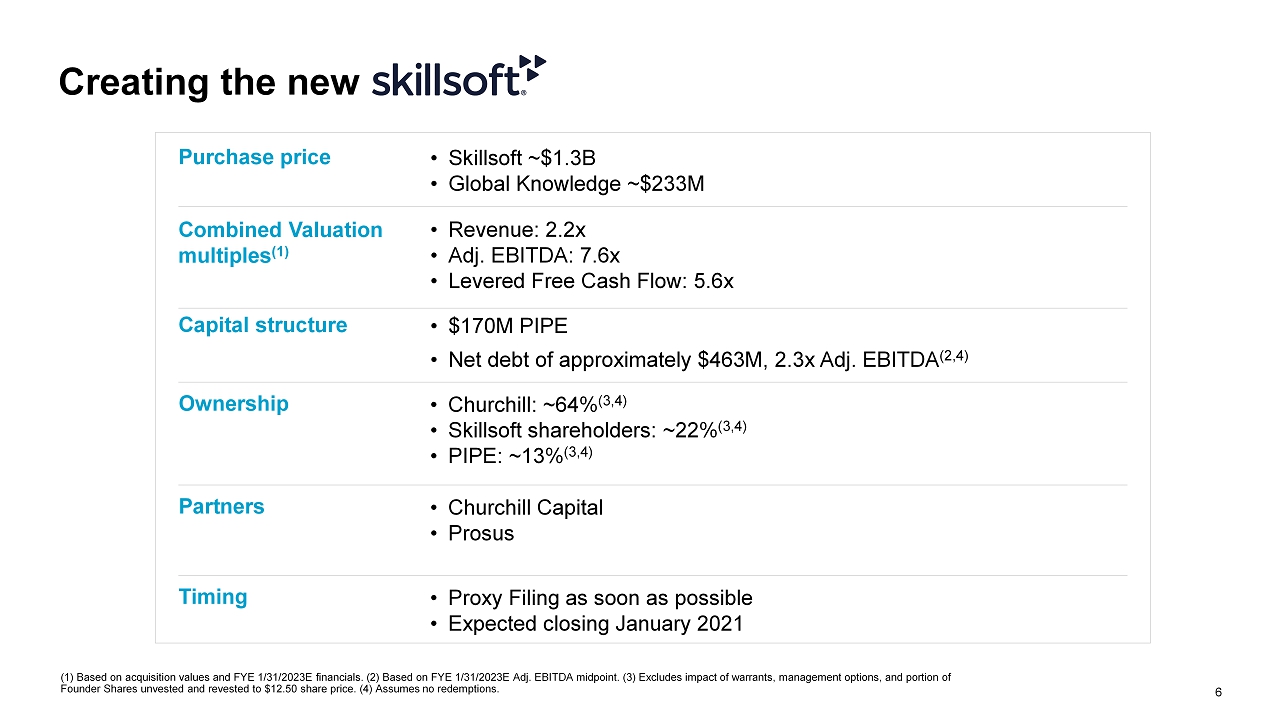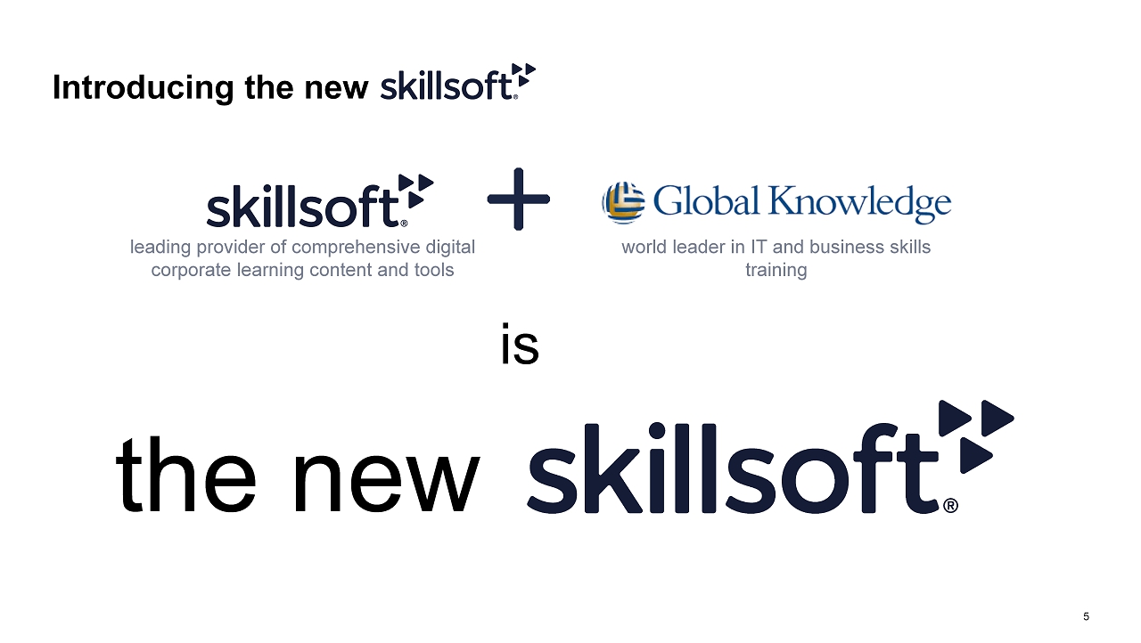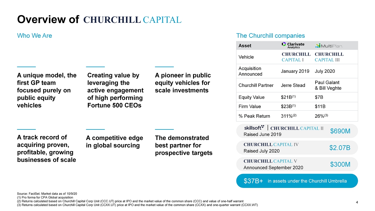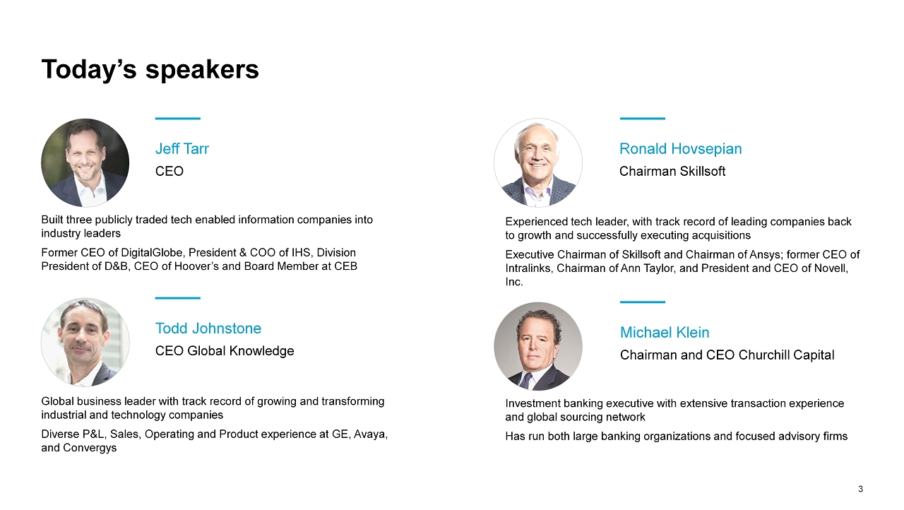 3 Today’s speakers Global business leader with track record of growing and transforming industrial and technology companies Diverse P&L, Sales, Operating and Product experience at GE, Avaya, and Convergys Todd Johnstone CEO Global Knowledge Jeff Tarr CEO Built three publicly traded tech enabled information companies into industry leaders Former CEO of DigitalGlobe , President & COO of IHS, Division President of D&B, CEO of Hoover’s and Board Member at CEB Investment banking executive with extensive transaction experience and global sourcing network Has run both large banking organizations and focused advisory firms Michael Klein Chairman and CEO Churchill Capital Experienced tech leader, with track record of leading companies back to growth and successfully executing acquisitions Executive Chairman of Skillsoft and Chairman of Ansys; former CEO of Intralinks, Chairman of Ann Taylor, and President and CEO of Novell, Inc. Ronald Hovsepian Chairman Skillsoft