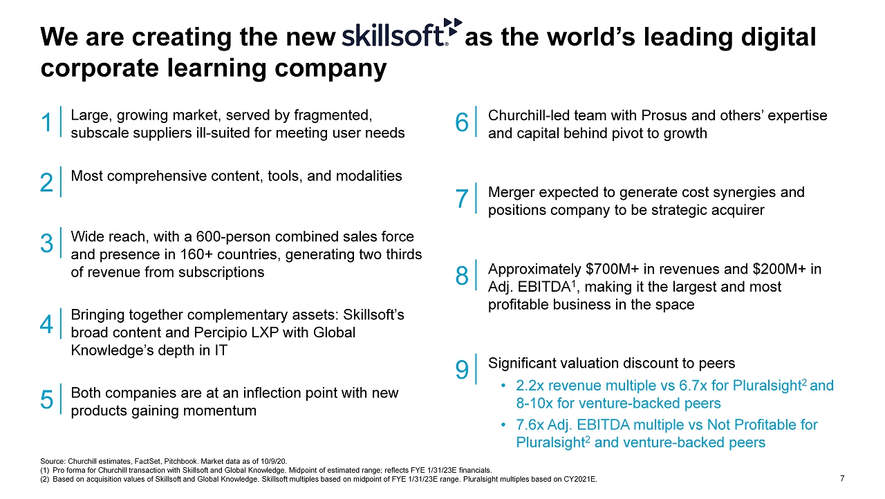 6 Creating the new Combined Valuation multiples (1) • Revenue: 2.2x • Adj. EBITDA: 7.6x • Levered Free Cash Flow: 5.6x Purchase price • Skillsoft ~$1.3B • Global Knowledge ~$233M Capital structure • $170M PIPE • Net debt of approximately $463M, 2.3x Adj. EBITDA (2,4) Ownership • Churchill: ~64% (3,4) • Skillsoft shareholders: ~22% (3,4) • PIPE: ~13% (3,4) Partners • Churchill Capital • Prosus Timing • Proxy Filing as soon as possible • Expected closing January 2021 (1) Based on acquisition values and FYE 1/31/2023E financials. (2) Based on FYE 1/31/2023E Adj. EBITDA midpoint. (3) Excludes im pact of warrants, management options, and portion of Founder Shares unvested and revested to $12.50 share price. (4) Assumes no redemptions.
