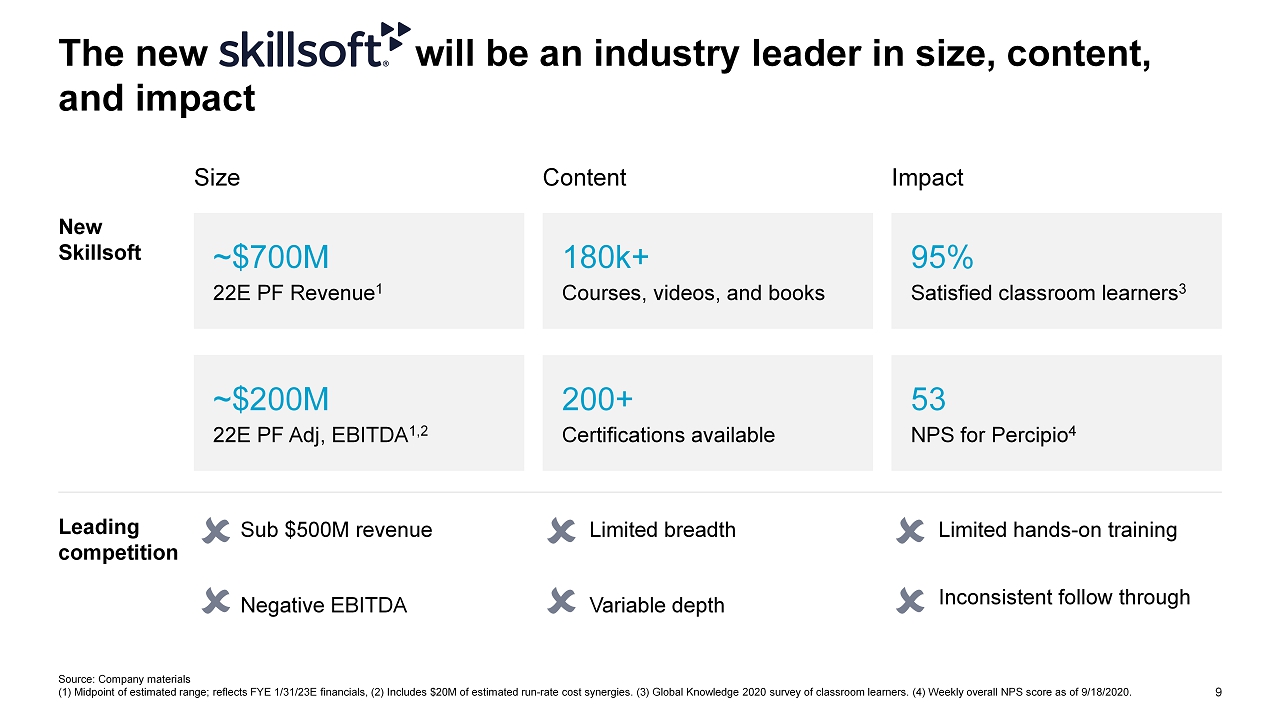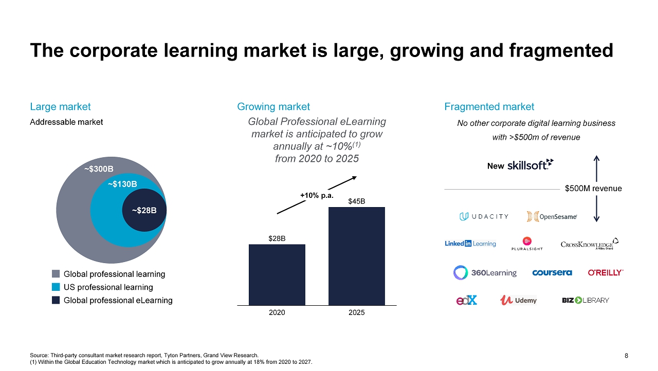 7 We are creating the new Skillsoft as the world’s leading digital corporate learning company Source: Churchill estimates, FactSet, Pitchbook. Market data as of 10/9/20. (1) Pro forma for Churchill transaction with Skillsoft and Global Knowledge. Midpoint of estimated range; reflects FYE 1/31/23E financials. (2) Based on acquisition values of Skillsoft and Global Knowledge. Skillsoft multiples based on midpoint of FYE 1/31/23E range. P lur alsight multiples based on CY2021E. Large, growing market, served by fragmented, subscale suppliers ill - suited for meeting user needs 1 Most comprehensive content, tools, and modalities 2 Wide reach, with a 600 - person combined sales force and presence in 160+ countries, generating two thirds of revenue from subscriptions 3 Bringing together complementary assets: Skillsoft’s broad content and Percipio LXP with Global Knowledge’s depth in IT 4 Both companies are at an inflection point with new products gaining momentum 5 Churchill - led team with Prosus and others’ expertise and capital behind pivot to growth 6 Merger expected to generate cost synergies and positions company to be strategic acquirer 7 Approximately $700M+ in revenues and $200M+ in Adj. EBITDA 1 , making it the largest and most profitable business in the space 8 Significant valuation discount to peers • 2.2x revenue multiple vs 6.7x for Pluralsight 2 and 8 - 10x for venture - backed peers • 7.6x Adj. EBITDA multiple vs Not Profitable for Pluralsight 2 and venture - backed peers 9