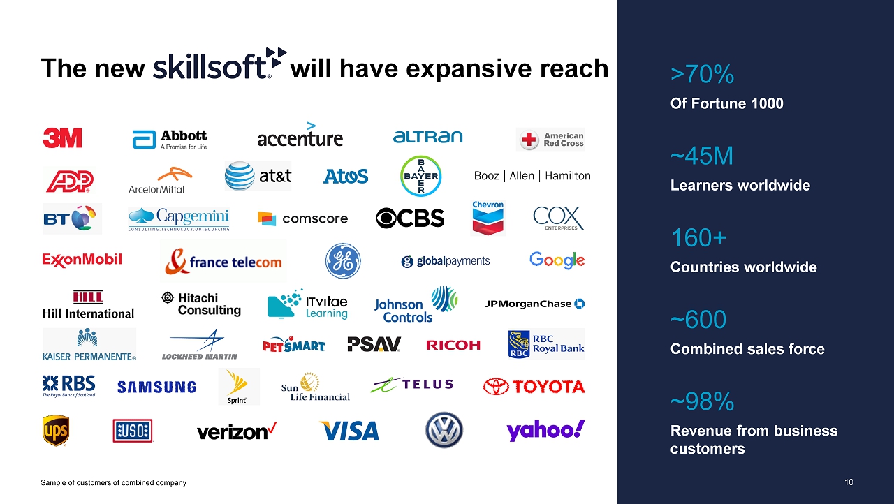 9 The new Skillsoft will be an industry leader in size, content, and impact Limited hands - on training Inconsistent follow through Sub $500M revenue Negative EBITDA Limited breadth Variable depth Impact Size Content ~ $700M 22E PF Revenue 1 ~$200M 22E PF Adj, EBITDA 1,2 53 NPS for Percipio 4 180k+ Courses, videos, and books 200 + Certifications available 95% Satisfied classroom learners 3 New Skillsoft Leading competition Source: Company materials (1) Midpoint of estimated range; reflects FYE 1/31/23E financials, (2) Includes $20M of estimated run - rate cost synergies. (3) G lobal Knowledge 2020 survey of classroom learners. (4) Weekly overall NPS score as of 9/18/2020.