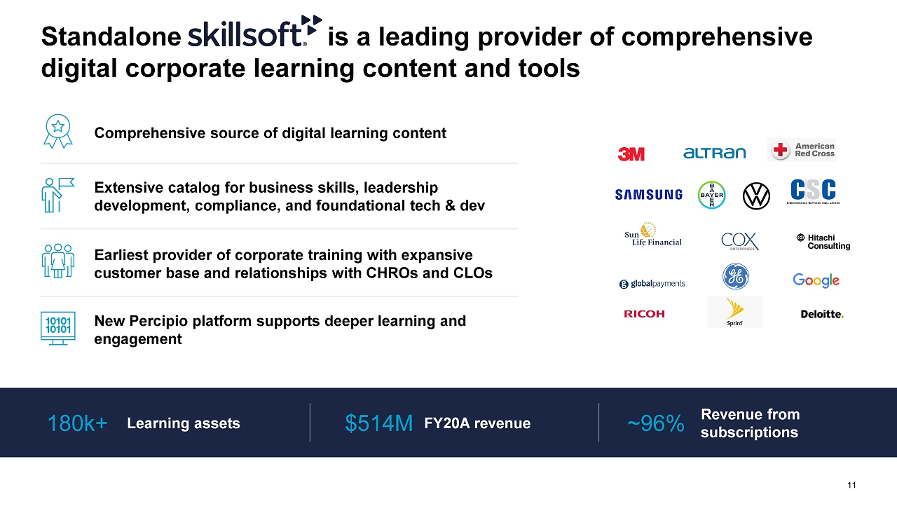 10 The new Skillsoft will have expansive reach Sample of customers of combined company 160+ Countries worldwide >70% Of Fortune 1000 ~ 45M Learners worldwide ~600 Combined sales force 10 ~98 % Revenue from business customers