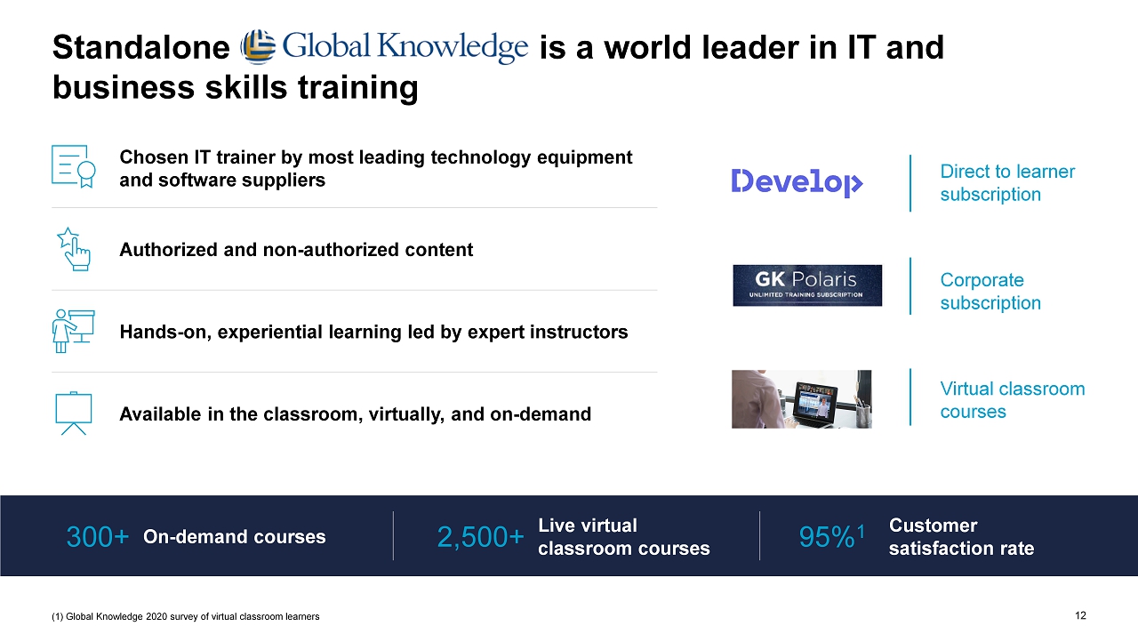 11 Standalone Skillsoft is a leading provider of comprehensive digital corporate learning content and tools Comprehensive source of digital learning content Earliest provider of corporate training with expansive customer base and relationships with CHROs and CLOs New Percipio platform supports deeper learning and engagement Learning assets 180k+ $514M FY20A revenue ~96% Revenue from subscriptions Extensive catalog for business skills, leadership development, compliance, and foundational tech & dev