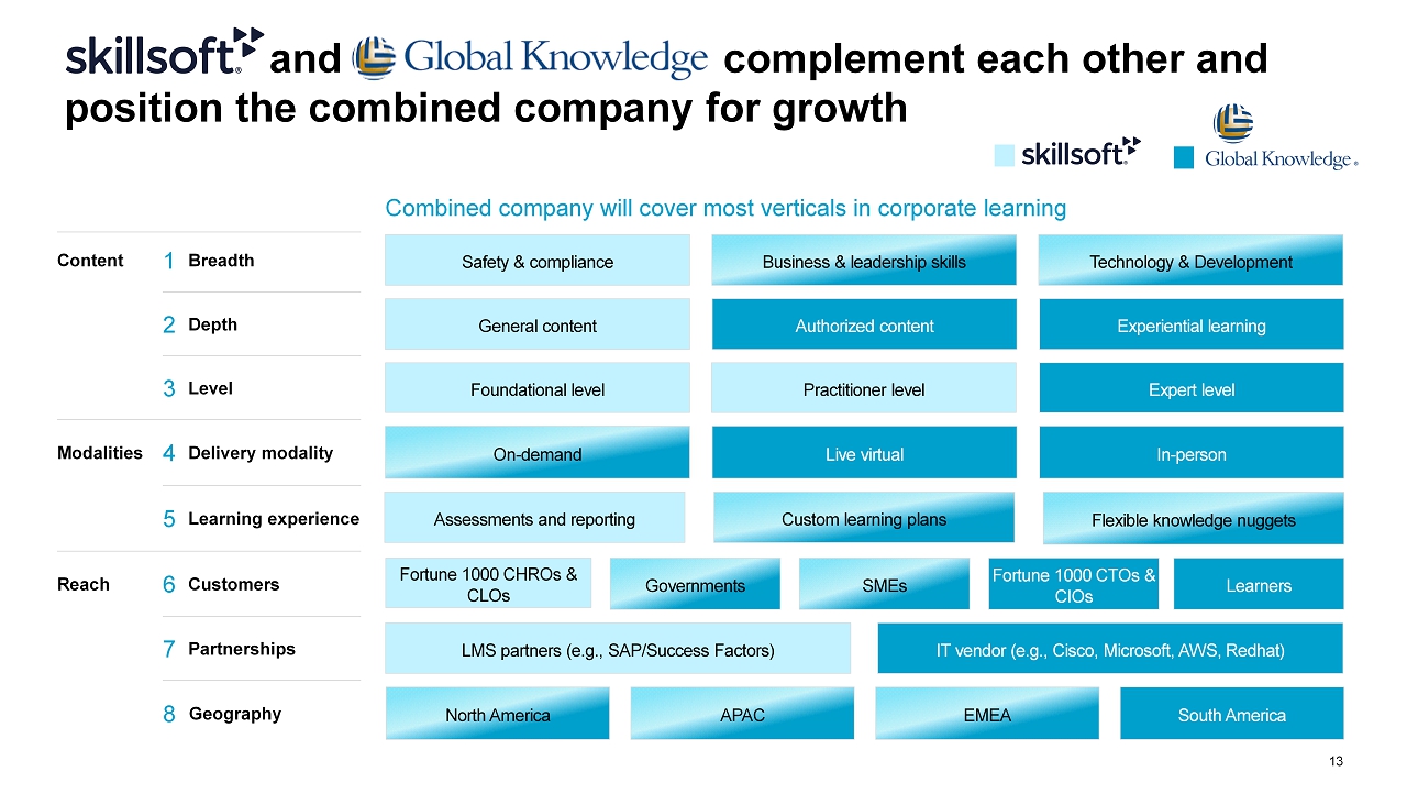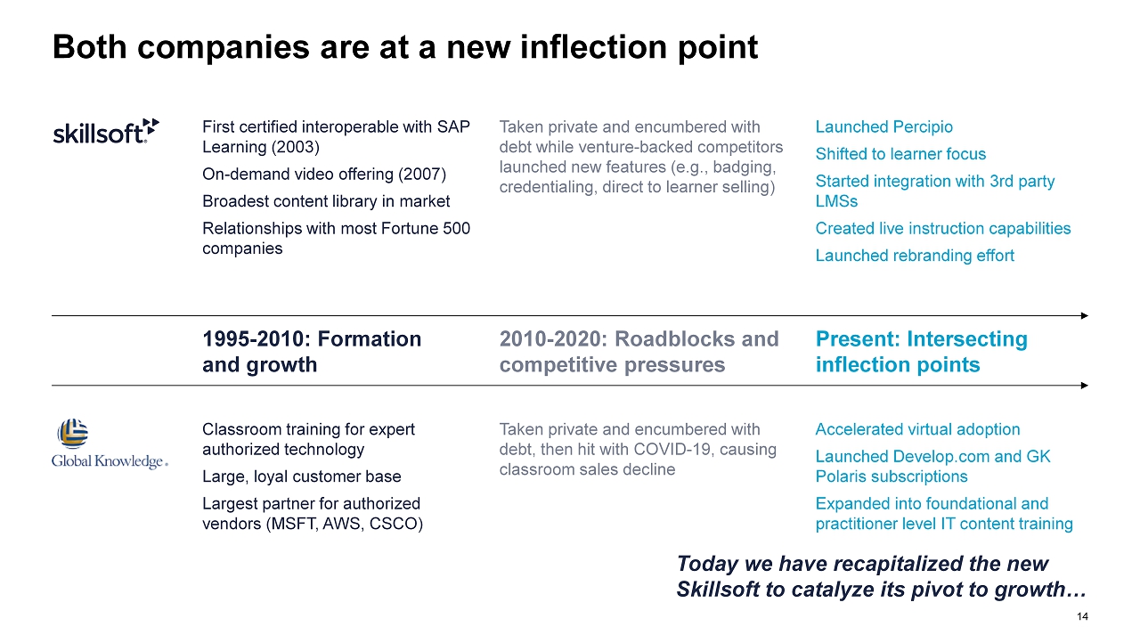 13 Skillsoft and Global Knowledge complement each other and position the combined company for growth Combined company will cover most verticals in corporate learning 8 Geography Content 1 Breadth 2 Depth 3 Level 7 Partnerships Modalities 4 Delivery modality 5 Learning experience Reach 6 Customers North America EMEA APAC Safety & compliance Technology & Development Business & leadership skills General content Foundational level Practitioner level LMS partners (e.g., SAP/Success Factors) On - demand Assessments and reporting Flexible knowledge nuggets Custom learning plans Fortune 1000 CHROs & CLOs SMEs Governments Fortune 1000 CHROs & CLOs SMEs Governments North America EMEA APAC Safety & compliance Technology & Development Business & leadership skills General content Foundational level Practitioner level LMS partners (e.g., SAP/Success Factors) On - demand Assessments and reporting Flexible knowledge nuggets Custom learning plans Authorized content Experiential learning Live virtual In - person Expert level IT vendor (e.g., Cisco, Microsoft, AWS, Redhat ) Fortune 1000 CTOs & CIOs Learners South America