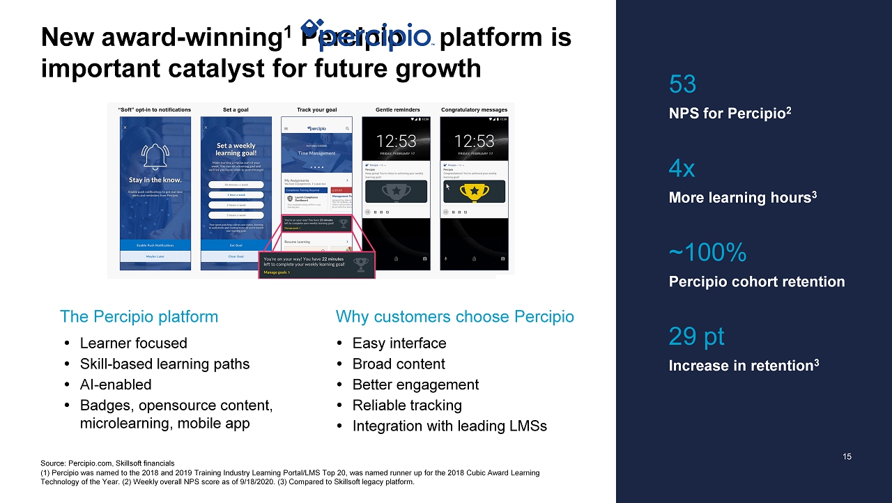 14 Both companies are at a new inflection point Present: Intersecting inflection points 2010 - 2020: Roadblocks and competitive pressures 1995 - 2010: Formation and growth Accelerated virtual adoption Launched Develop.com and GK Polaris subscriptions Expanded into foundational and practitioner level IT content training Taken private and encumbered with debt, then hit with COVID - 19, causing classroom sales decline Classroom training for expert authorized technology Large, loyal customer base Largest partner for authorized vendors (MSFT, AWS, CSCO) Launched Percipio Shifted to learner focus Started integration with 3rd party LMSs Created live instruction capabilities Launched rebranding effort Taken private and encumbered with debt while venture - backed competitors launched new features (e.g., badging, credentialing, direct to learner selling) First certified interoperable with SAP Learning (2003) On - demand video offering (2007) Broadest content library in market Relationships with most Fortune 500 companies Today we have recapitalized the new Skillsoft to catalyze its pivot to growth…