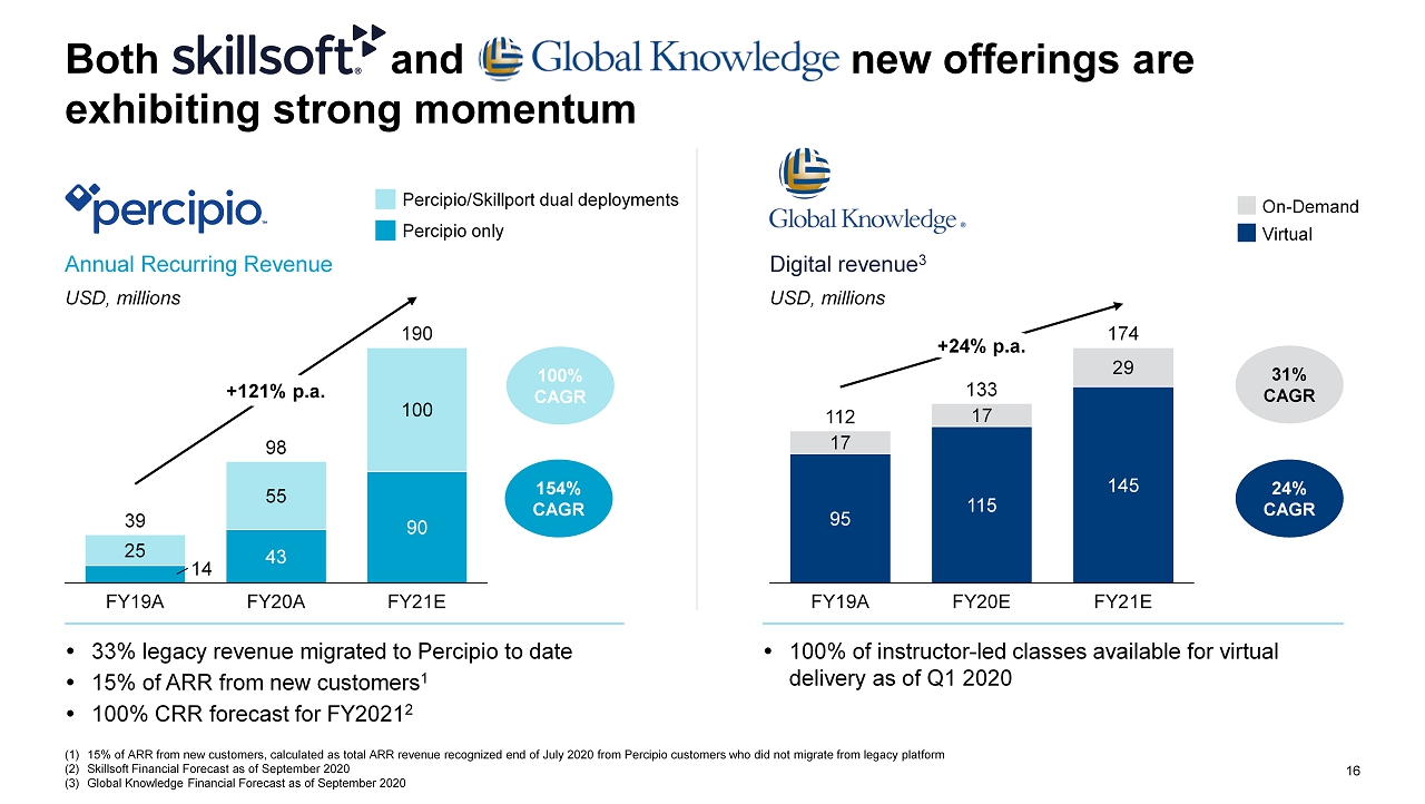 15 New award - winning 1 Percipio platform is important catalyst for future growth Source: Percipio.com, Skillsoft financials (1) Percipio was named to the 2018 and 2019 Training Industry Learning Portal/LMS Top 20, was named runner up for the 2018 Cubic Award Lea rn ing Technology of the Year. (2) Weekly overall NPS score as of 9/18/2020. (3) Compared to Skillsoft legacy platform. 29 pt Increase in retention 3 53 NPS for Percipio 2 4x More learning hours 3 15 Why customers choose Percipio Easy interface Broad content Better engagement Reliable tracking Integration with leading LMSs Learner focused Skill - based learning paths AI - enabled B adges , opensource content, microlearning, mobile app The Percipio platform ~100% Percipio c ohort retention