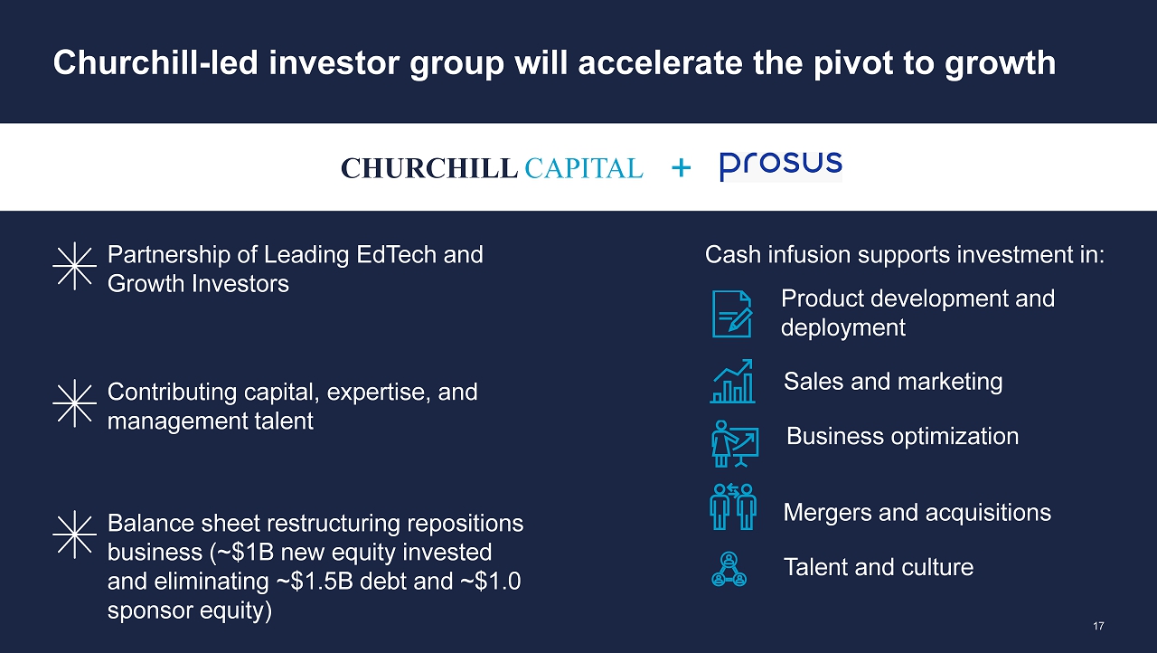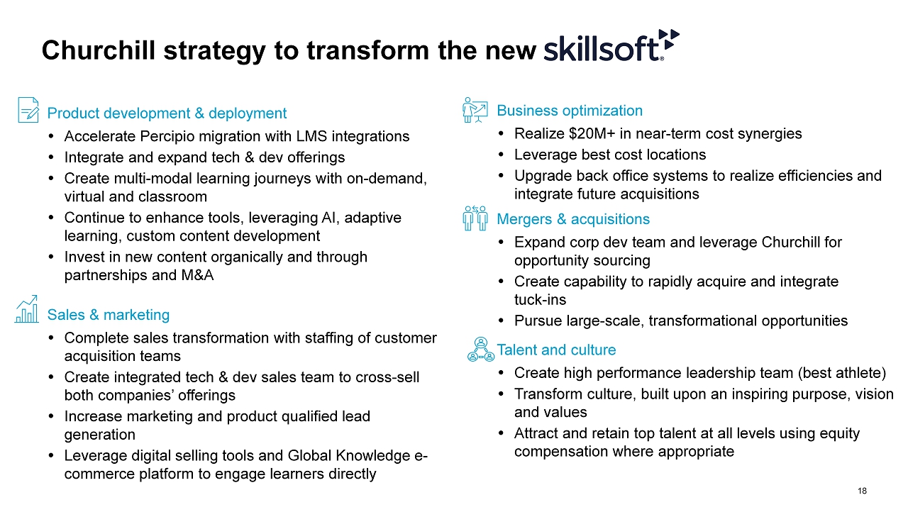 17 Churchill - led investor group will accelerate the pivot to growth Partnership of Leading EdTech and Growth Investors Cash infusion supports investment in: Business optimization Mergers and acquisitions Product development and deployment Sales and marketing Talent and culture Contributing capital, expertise, and management talent Balance sheet restructuring repositions business (~$1B new equity invested and eliminating ~$1.5B debt and ~$1.0 sponsor equity) CHURCHILL CAPITAL +