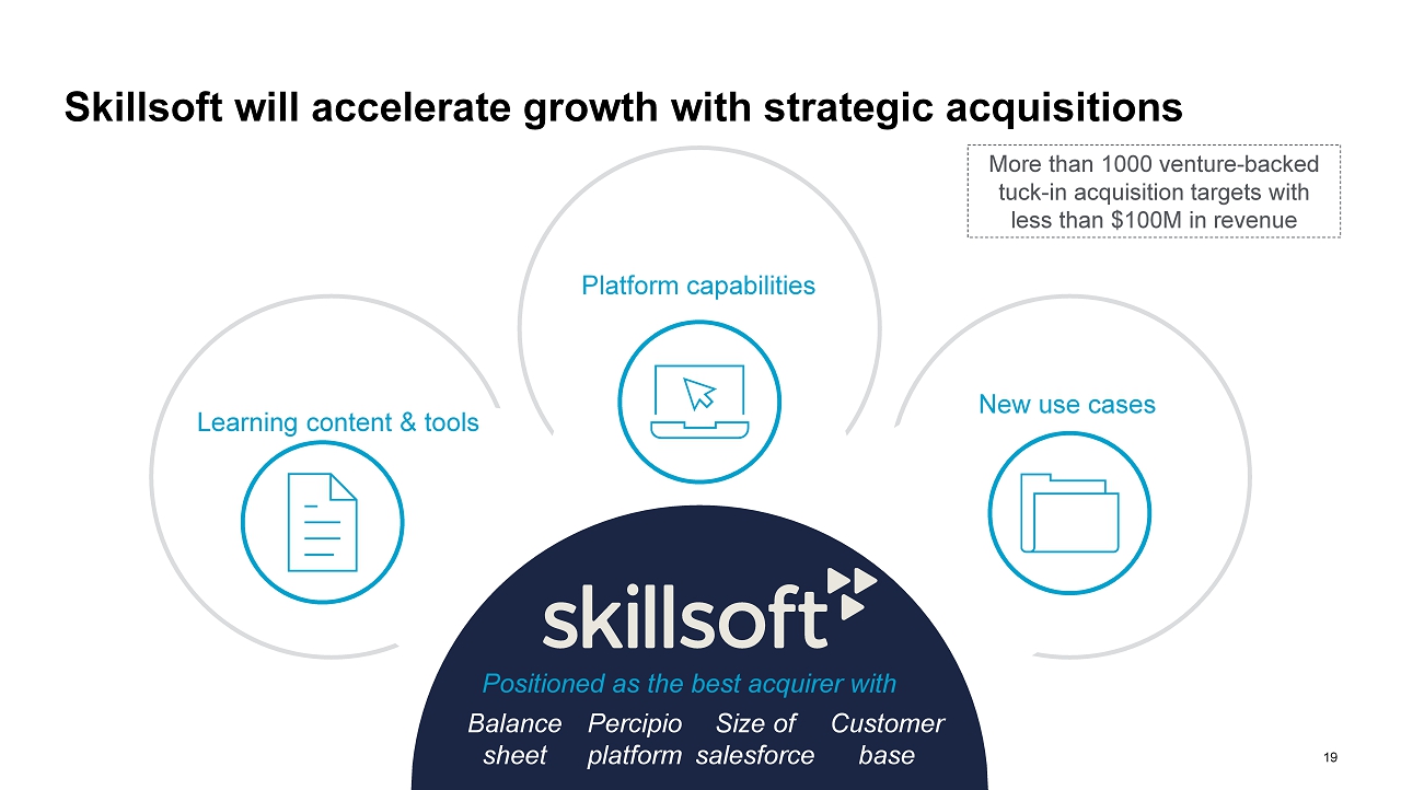 18 Churchill strategy to transform the new Skillsoft Sales & marketing Complete sales transformation with staffing of customer acquisition teams Create integrated tech & dev sales team to cross - sell both companies’ offerings Increase marketing and product qualified lead generation Leverage digital selling tools and Global Knowledge e - commerce platform to engage learners directly Product development & deployment Accelerate Percipio migration with LMS integrations Integrate and expand tech & dev offerings Create multi - modal learning journeys with on - demand, virtual and classroom Continue to enhance tools, leveraging AI, adaptive learning, custom content development Invest in new content organically and through partnerships and M&A Mergers & acquisitions Expand corp dev team and leverage Churchill for opportunity sourcing Create capability to rapidly acquire and integrate tuck - ins Pursue large - scale, transformational opportunities Talent and culture Create high performance leadership team (best athlete) Transform culture, built upon an inspiring purpose, vision and values Attract and retain top talent at all levels using equity compensation where appropriate Business optimization Realize $20M+ in near - term cost synergies Leverage best cost locations Upgrade back office systems to realize efficiencies and integrate future acquisitions