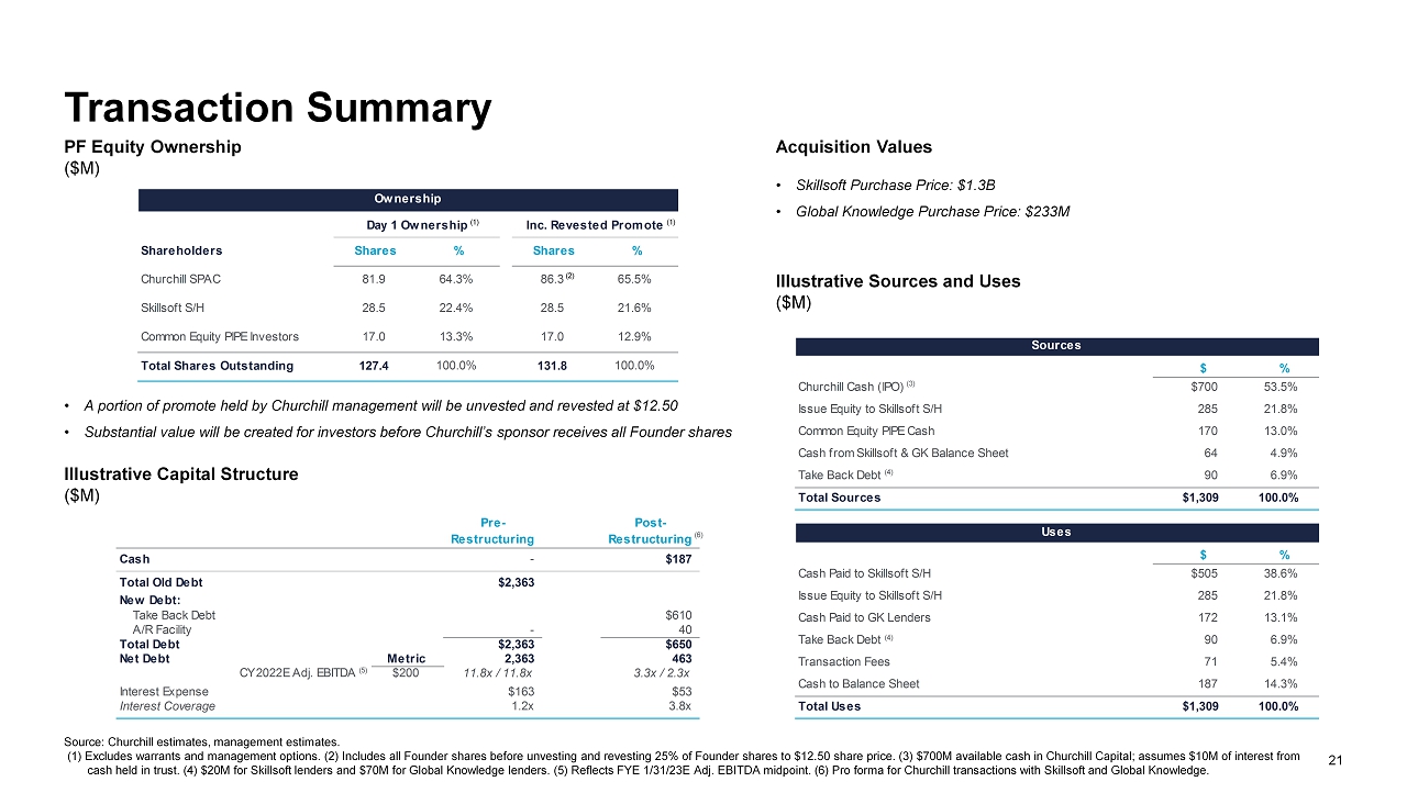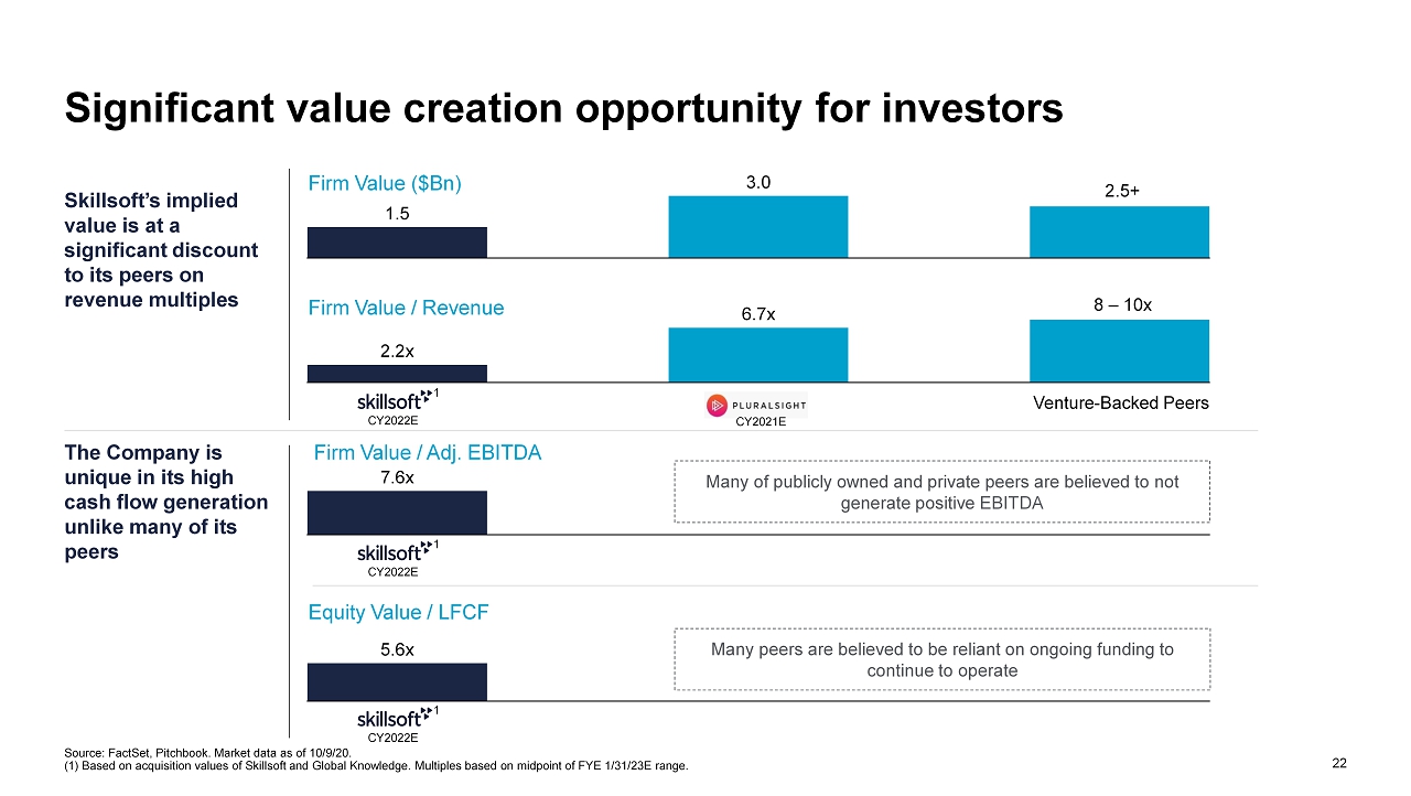 21 Sources $ % Churchill Cash (IPO) $700 53.5% Issue Equity to Skillsoft S/H 285 21.8% Common Equity PIPE Cash 170 13.0% Cash from Skillsoft & GK Balance Sheet 64 4.9% Take Back Debt 90 6.9% Total Sources $1,309 100.0% Uses $ % Cash Paid to Skillsoft S/H $505 38.6% Issue Equity to Skillsoft S/H 285 21.8% Cash Paid to GK Lenders 172 13.1% Take Back Debt 90 6.9% Transaction Fees 71 5.4% Cash to Balance Sheet 187 14.3% Total Uses $1,309 100.0% Transaction Summary PF Equity Ownership ($M) Illustrative Sources and Uses ($M) (3) Source: Churchill estimates, management estimates. (1) Excludes warrants and management options. (2) Includes all Founder shares before unvesting and revesting 25% of Founder shares to $12.50 share price. (3) $700M available cash in Churchill Capital; assumes $10M of int er est from cash held in trust. (4) $20M for Skillsoft lenders and $70M for Global Knowledge lenders. (5) Reflects FYE 1/31/23E Adj. EBIT DA midpoint. (6) Pro forma for Churchill transactions with Skillsoft and Global Knowledge. Ownership Day 1 Ownership Inc. Revested Promote Shareholders Shares % Shares % Churchill SPAC 81.9 64.3% 86.3 65.5% Skillsoft S/H 28.5 22.4% 28.5 21.6% Common Equity PIPE Investors 17.0 13.3% 17.0 12.9% Total Shares Outstanding 127.4 100.0% 131.8 100.0% (1) (1) (2) • A portion of promote held by Churchill management will be unvested and revested at $12.50 • Substantial value will be created for investors before Churchill’s sponsor receives all Founder shares (4) (4) • Skillsoft Purchase Price: $1.3B • Global Knowledge Purchase Price: $233M Acquisition Values Pre- Restructuring Post- Restructuring Cash - $187 Total Old Debt $2,363 New Debt: Take Back Debt $610 A/R Facility - 40 Total Debt $2,363 $650 Net Debt Metric 2,363 463 CY2022E Adj. EBITDA $200 11.8x / 11.8x 3.3x / 2.3x Interest Expense $163 $53 Interest Coverage 1.2x 3.8x Illustrative Capital Structure ($M) (5) (6)