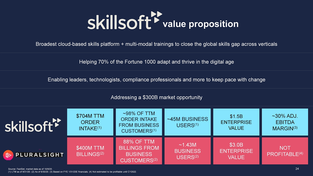 22 7.6x Significant value creation opportunity for investors Skillsoft’s implied value is at a significant discount to its peers on revenue m ultiples The Company is u nique in its high cash flow g eneration u nlike many of its peers Equity Value / LFCF Many of publicly owned and private peers are believed to not generate positive EBITDA Many peers are believed to be reliant on ongoing funding to continue to operate 2.2x 6.7x Firm Value / Revenue 5.6x Firm Value / Adj. EBITDA Source: FactSet , Pitchbook. Market data as of 10/9/20. (1) Based on acquisition values of Skillsoft and Global Knowledge. Multiples based on midpoint of FYE 1/31/23E range. 1.5 3.0 Firm Value ($Bn) CY2021E 1 CY2022E 1 CY2022E 1 CY2022E 2.5+ 8 – 10x Venture - Backed Peers