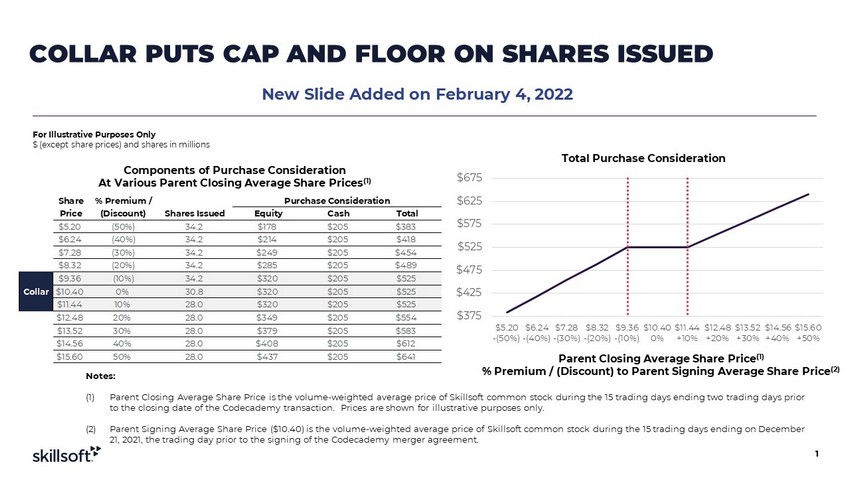 Components of Purchase Consideration At Various Parent Closing Average Share Prices (1) 1 Parent Closing Average Share Price (1) % Premium / (Discount) to Parent Signing Average Share Price (2) $375 $425 $475 $525 $575 $625 $675 $5.20 -(50%) $6.24 -(40%) $7.28 -(30%) $8.32 -(20%) $9.36 -(10%) $10.40 0% $11.44 +10% $12.48 +20% $13.52 +30% $14.56 +40% $15.60 +50% Total Purchase Consideration For Illustrative Purposes Only $ (except share prices) and shares in millions Share % Premium / Purchase Consideration Price (Discount) Shares Issued Equity Cash Total $5.20 (50%) 34.2 $178 $205 $383 $6.24 (40%) 34.2 $214 $205 $418 $7.28 (30%) 34.2 $249 $205 $454 $8.32 (20%) 34.2 $285 $205 $489 $9.36 (10%) 34.2 $320 $205 $525 Collar $10.40 0% 30.8 $320 $205 $525 $11.44 10% 28.0 $320 $205 $525 $12.48 20% 28.0 $349 $205 $554 $13.52 30% 28.0 $379 $205 $583 $14.56 40% 28.0 $408 $205 $612 $15.60 50% 28.0 $437 $205 $641 Notes: (1) Parent Closing Average Share Price is the volume - weighted average price of Skillsoft common stock during the 15 trading days end ing two trading days prior to the closing date of the Codecademy transaction. Prices are shown for illustrative purposes only. (2) Parent Signing Average Share Price ($10.40) is the volume - weighted average price of Skillsoft common stock during the 15 trading days ending on December 21, 2021, the trading day prior to the signing of the Codecademy merger agreement. COLLAR PUTS CAP AND FLOOR ON SHARES ISSUED New Slide Added on February 4, 2022